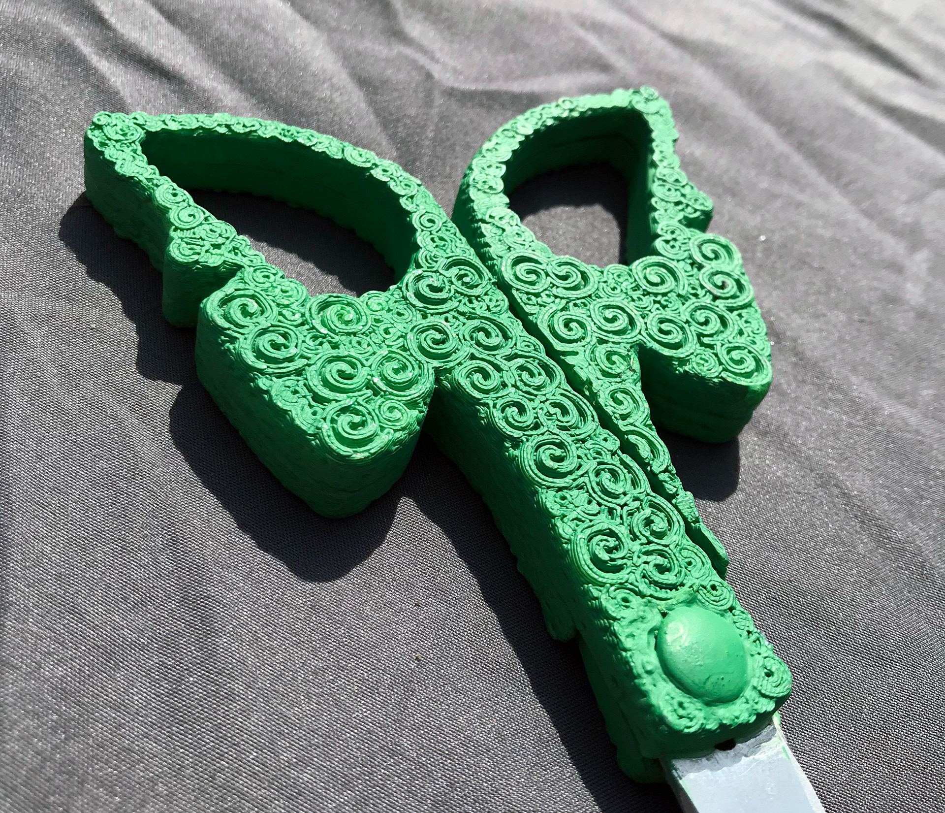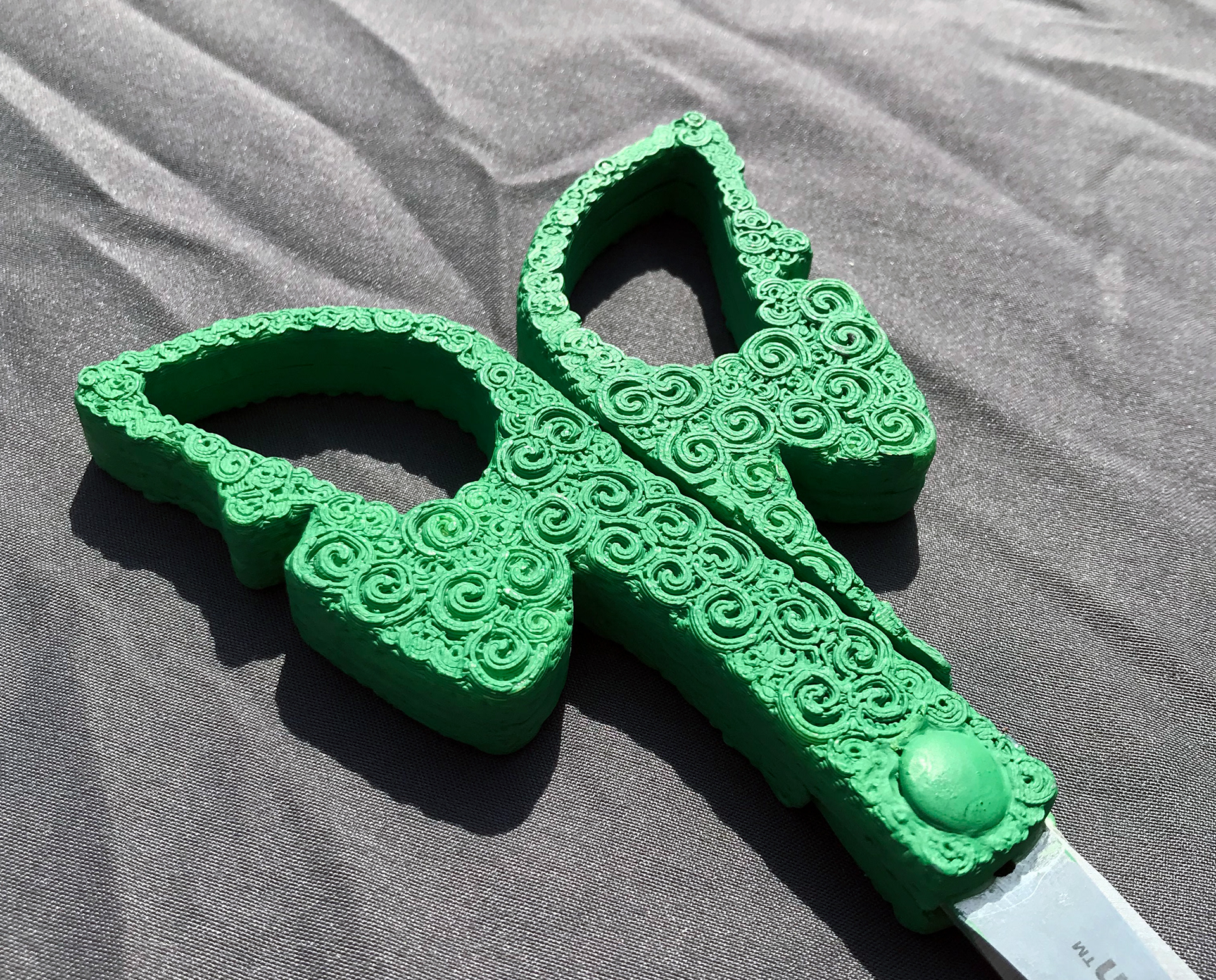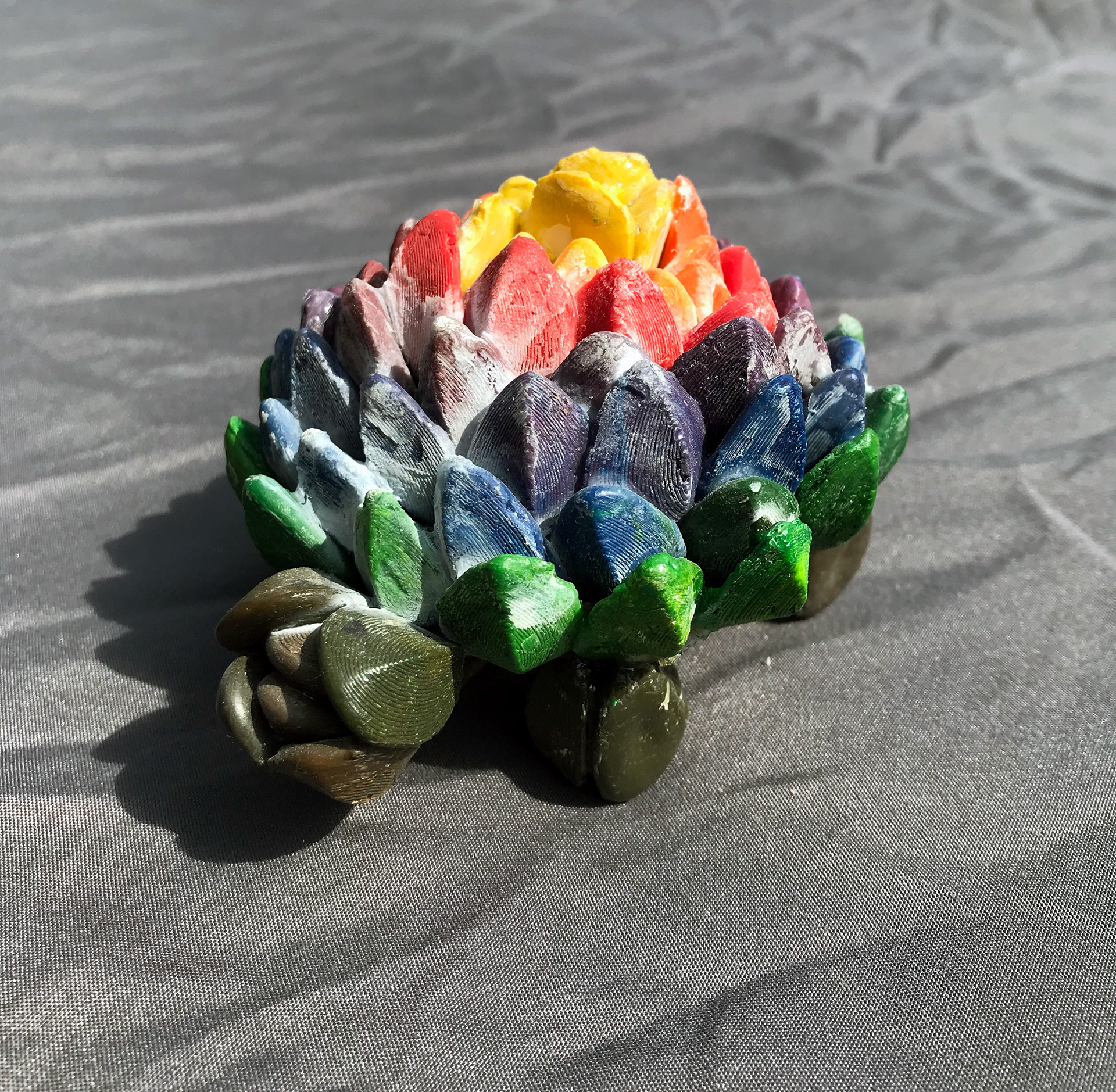 These 3D art works were mostly done with the program Rhino. The wood pieces were laser cut out and put together. The scissor handles were 3D printed. The turtle sculpture is all small wax pieces that were modeled from a silicone mold I created.