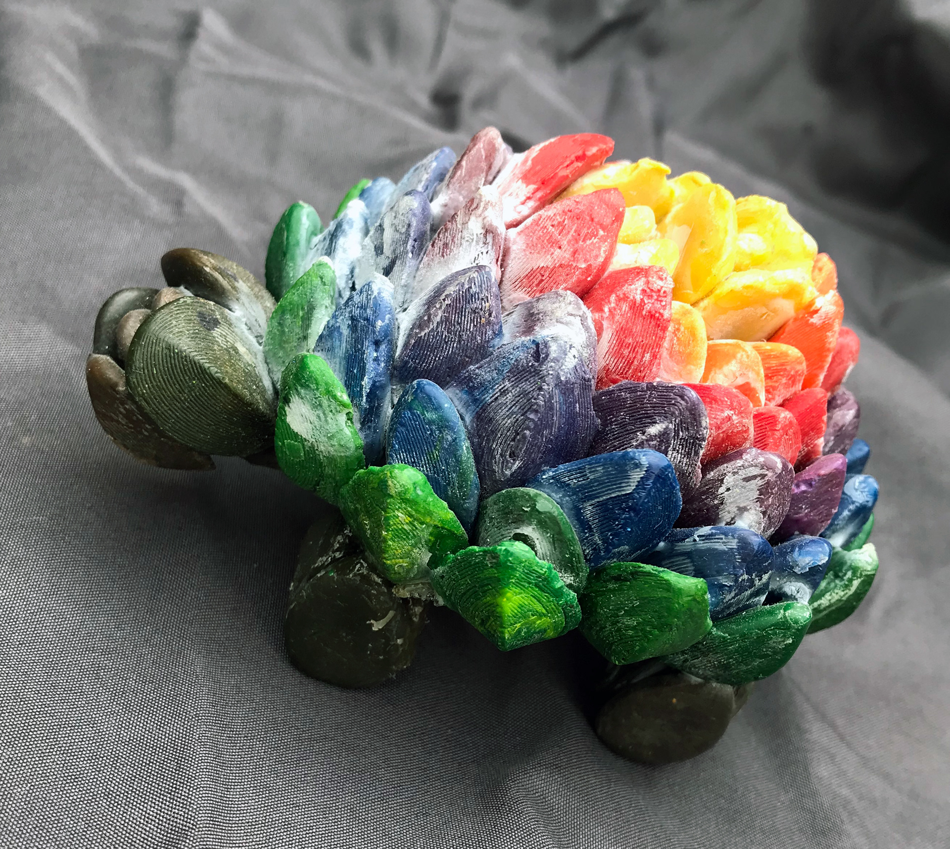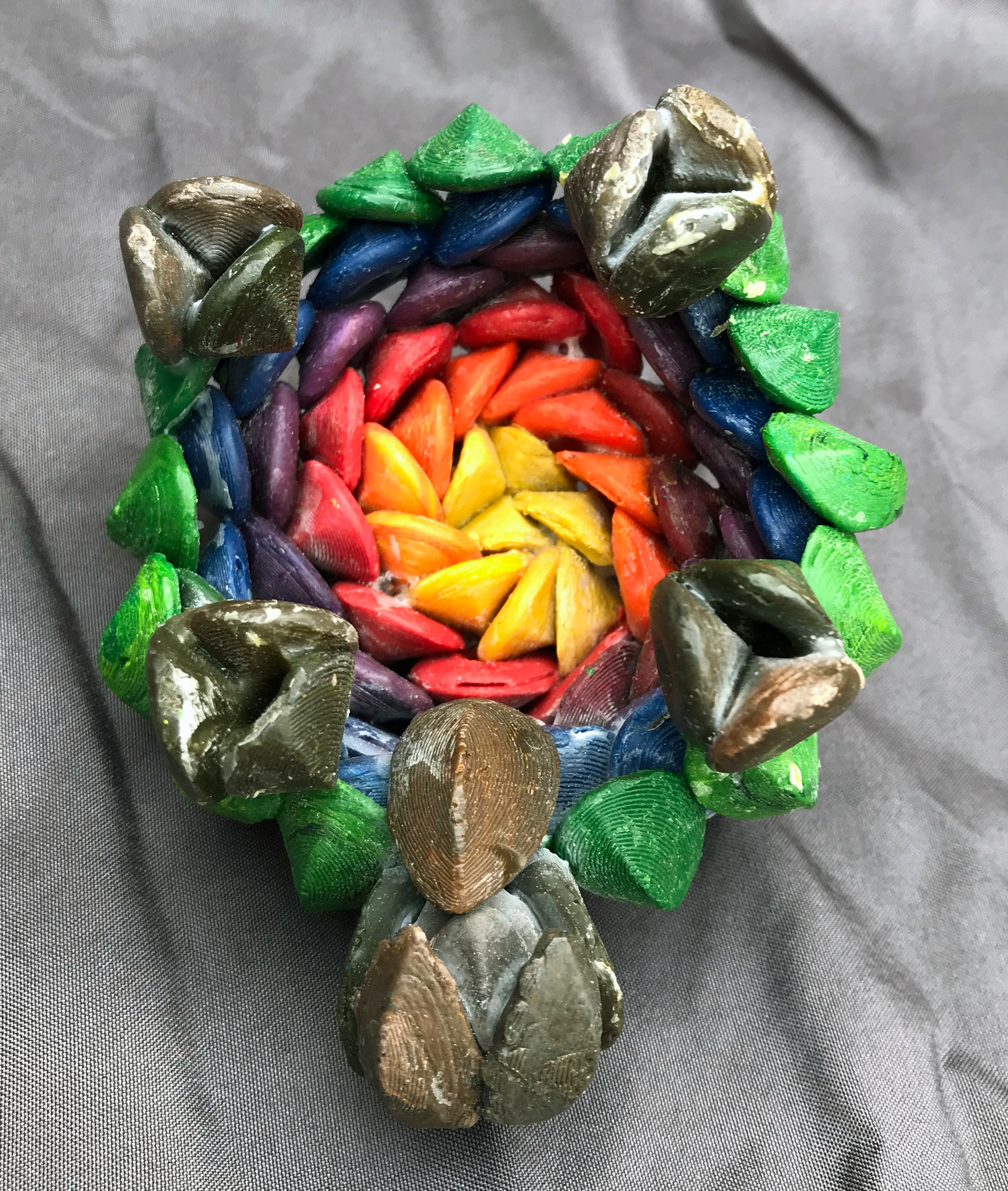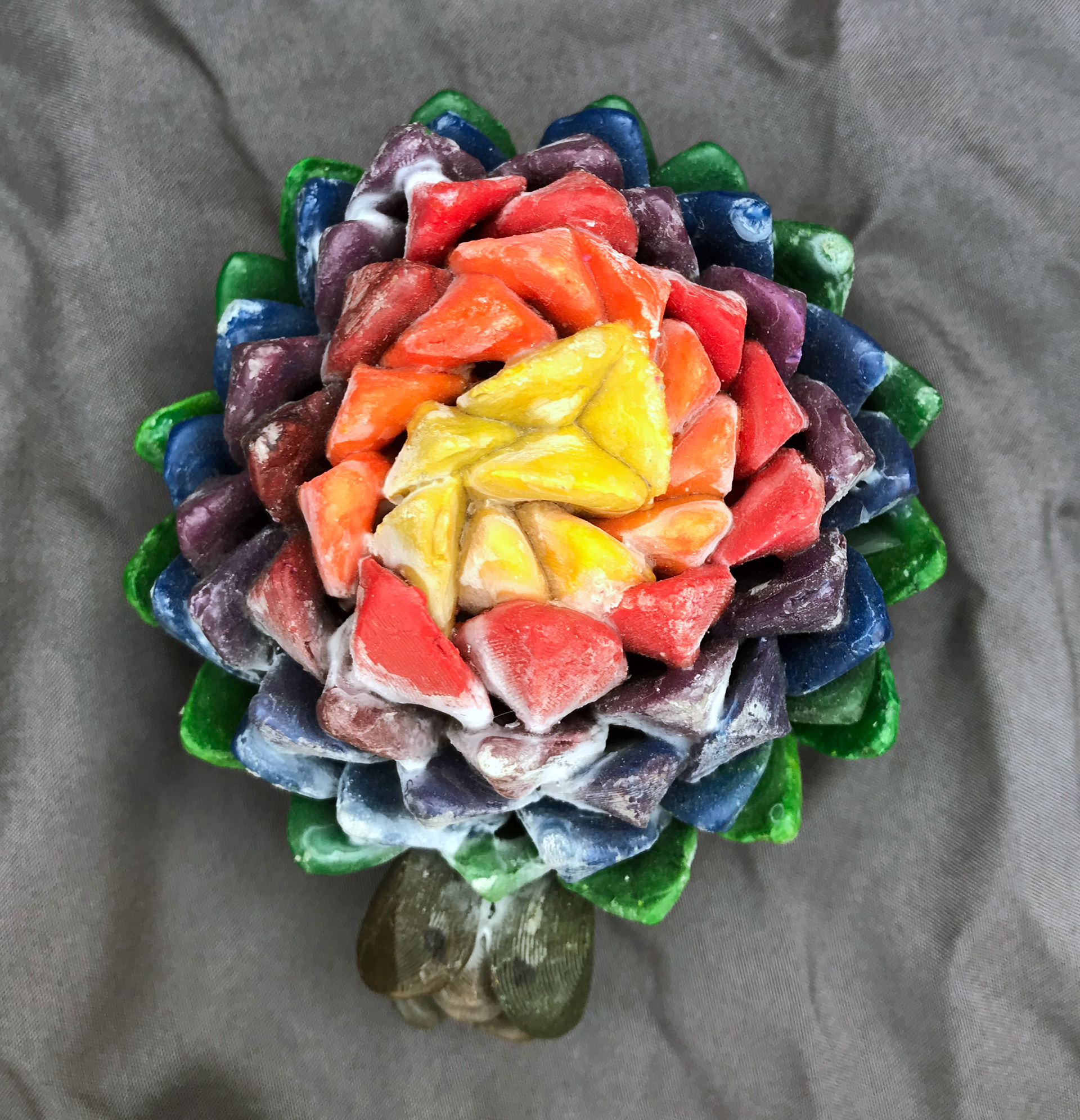 These 3D art works were mostly done with the program Rhino. The wood pieces were laser cut out and put together. The scissor handles were 3D printed. The turtle sculpture is all small wax pieces that were modeled from a silicone mold I created.